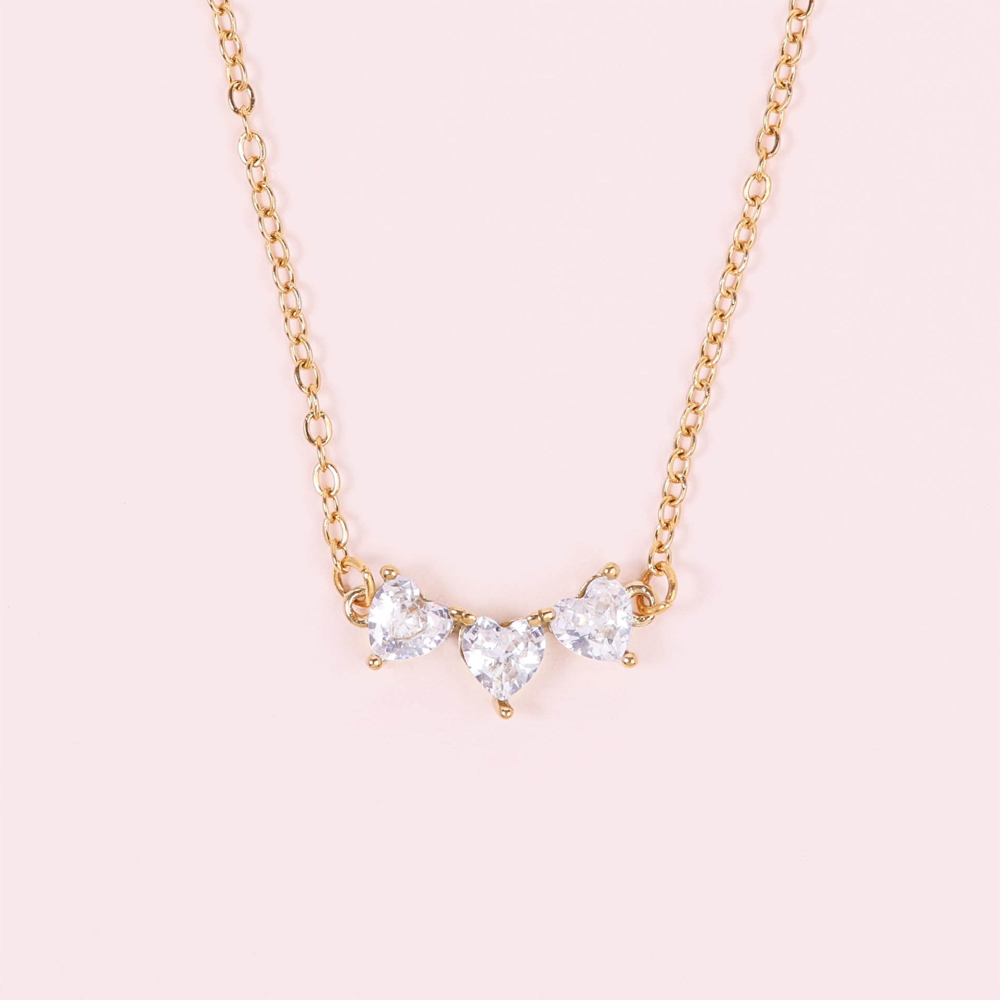Meet your new everyday sparkle, a delicate trio of heart shaped stones set on a fine gold tone chain, designed to catch the light with every move.